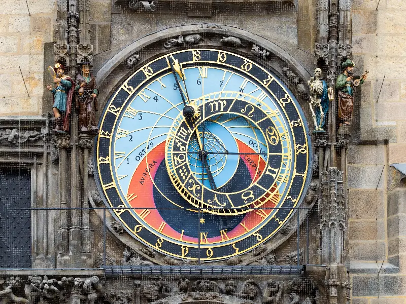 首先令人著迷的是天文鐘的機械奇蹟。整組鐘分成三層:最上層顯示著不同時刻的「使徒遊行」,中層是天文顯示板,最下層是日曆圓盤。天文層以藍色、紅色和黑色代表晝、黃昏、夜,交織出一天的變換。更精妙的是,鐘面外圍以古捷克文標註時間,金色阿拉伯數字顯示二十四小時制-每當太陽運行時,鐘面上就會同步跟著移動,完美呈現天文與人文的交錯之美。