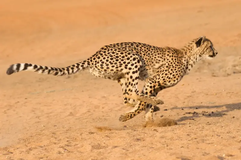 獵豹的尾巴長度大約和身體相當,約為60—80公分;一屁股後頭,不只是裝飾或保暖用,而是名副其實的「方向舵」。當獵豹全速奔馳於草原追逐獵物時,必須在極短時間內作出劇烈且精確的方向變換,不僅要跟上機敏的羚羊或鴕鳥的閃躲,還要保持自己身軀的平衡。這時,長長的尾巴便成了牠身體的「平衡器」與「方向盤」。