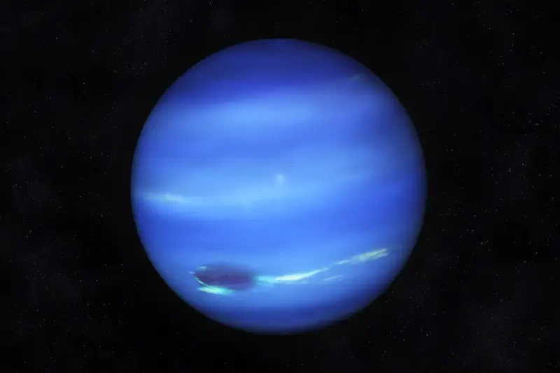 別忘了在外側的「天王星」和「海王星」,這兩顆冰巨星展現出令人驚豔的藍色調。這種藍色主要來自於大氣中的「甲烷氣體」,甲烷強烈吸收紅光,讓太陽光中的藍色波長被更有效地散射出去。因此,無論是用望遠鏡還是太空探測器所拍攝下來的照片,天王星帶有淡藍綠色,海王星則呈現更為深邃的寶藍色。