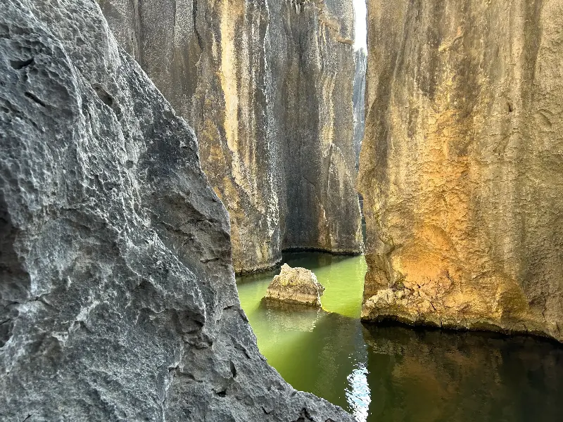 「溶蝕」是這裡最關鍵的過程。當雨水與二氧化碳結合時,會形成弱酸性的碳酸水,這種水流過石灰岩裂縫時,會逐步溶解岩石,擴大裂縫,使石塊逐漸分離,最後只剩下較堅硬、抗蝕的部分。這些剩下的石柱,因為年深日久持續被雨水、風力侵蝕,邊角愈發尖銳,宛如一座座天然的尖塔。這種地貌學稱為「石灰岩地形」(Karst landform),世界上許多地方都能見到,但像石林這樣規模龐大且形狀誇張的,實屬罕見。
