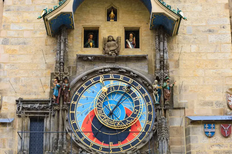 天文鐘建於1410年,是由鐘錶大師Mikuláš of Kadaň 與數學家Jan Šindel共同設計,跨越六個世紀依然精確運作。它不僅顯示時間,還包括天文資訊(如月相、太陽運行、星座)和曆法。鐘面下方還有一個可旋轉的曆法盤,每年一圈,展示當日期節以及聖人名字。這些複雜的構造讓人驚嘆於中世紀工藝之精細。